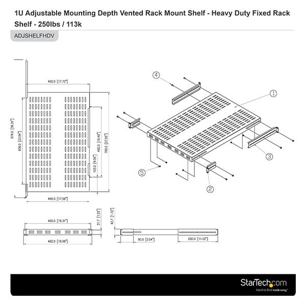Este estante de alta resistencia para montaje en rack se puede ajustar de 19,5" a 38" (profundidad de montaje) para adaptarse al rack y dispone de orificios de ventilación para mejorar la circulación de aire y disminuir la temperatura en el rack. Está fabricado en acero laminado en frío de grado comercial SPCC de 1,2 mm por lo que es capaz de albergar equipos de hasta 113kg (250 lbs) - una solución duradera para almacenar equipos grandes que no son de montaje en rack, herramientas pesadas o periféricos en una estantería o gabinete.