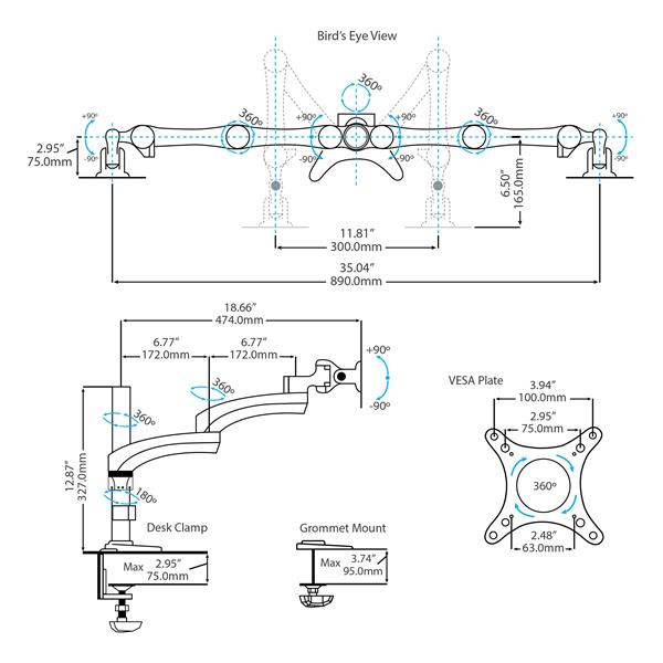 StarTech.com Articulating Dual Monitor Arm - Grommet / Desk Mount with Cable Management & Height Adjust. Maximum weight (capacity): 13.6 kg, Maximum screen size compatibility: 60.96 cm (24"), VESA mounting interfaces: 75 x 75, 100 x 100 mm. Swivel angle: 360°, Tilt angle: -90 - 90°, Pan range: -90 - 90°. Colour of product: Black, Material: Plastic, Steel. Package width: 30 cm, Package depth: 55 cm, Package height: 28 cm <<<Less
